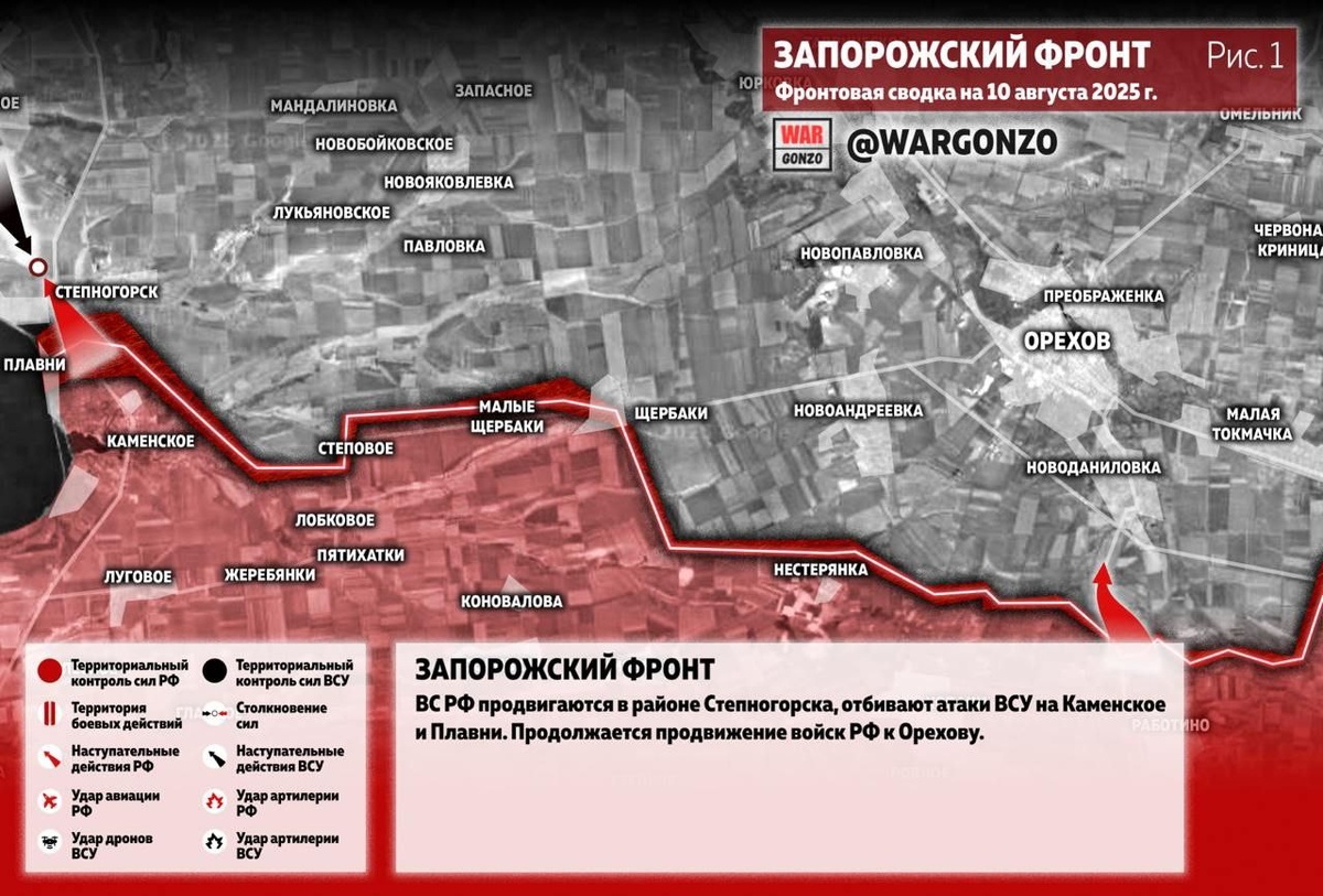Запорожский фронт. ВС РФ продвигаются в районе Степногорска, отбивают атаки ВСУ на Каменское и Плавни. Продолжается продвижение войск РФ к Орехову. (Рис. 1)