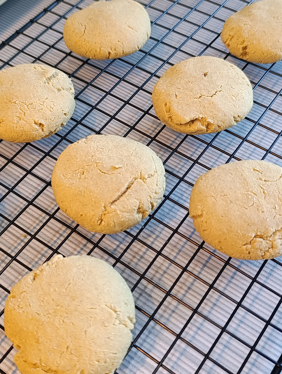 📌Ингредиенты: 30 гр. растопленное сливочное масло 1 яйцо 30 трастниковый сахар 30 гр. подсолнечная мука 120 гр. рисовая мука 1/2 ч.л. разрыхлитель щепотка соли ✅Приготовление: Растопленное сливочное масло соединить с трастниковым сахаром. Добавить яйцо. Перемешать. Муку 2х видов соединить с разрыхлителем, солью и добавить в жидкие ингредиенты. Перемешать. Собрать тесто в шар. Берём кусочек теста, формируем шарик и слегка сплющиваем. Заготовочки перекладываем на противень, застеленный силиконовым ковриком или пергаментной бумагой на небольшом расстоянии друг от друга. Убираем в разогретую духовку до 180С на 15 минут.