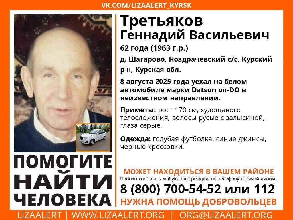 В Курске разыскивают 62-летнего Геннадия Третьякова, местонахождение которого неизвестно с 8 августа. Волонтеры отряда «ЛизаАлерт Курская область» сообщают, что он уехал на белом автомобиле марки Datsun on-DO в неизвестном направлении. Пропавший — житель областного центра, д. Шагарово. Его рост — 170 см, телосложение худощавое, волосы русые с залысиной, глаза серые. В день исчезновения был одет в голубую футболку, синие джинсы и черные кроссовки. Поисковики просят всех, кто обладает какой-либо информацией о месте нахождения мужчины, сообщить об этом по телефону горячей линии: 8-800-700-54-52 или по номеру 112.