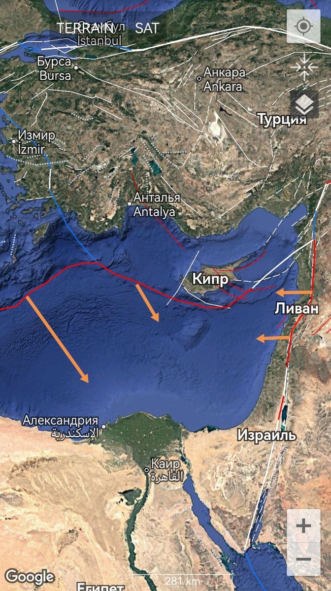 С ночи наблюдаются признаки дегазации уровня М6+ в Средиземном море между Критом, Кипром и побережьем Ливана. В течение недели возможны последствия в виде ощутимой сейсмики. ===== Since the night, there have been signs of degassing of the M6+ level in the Mediterranean Sea between Crete, Cyprus and the coast of Lebanon. There may be significant seismic effects during the week.