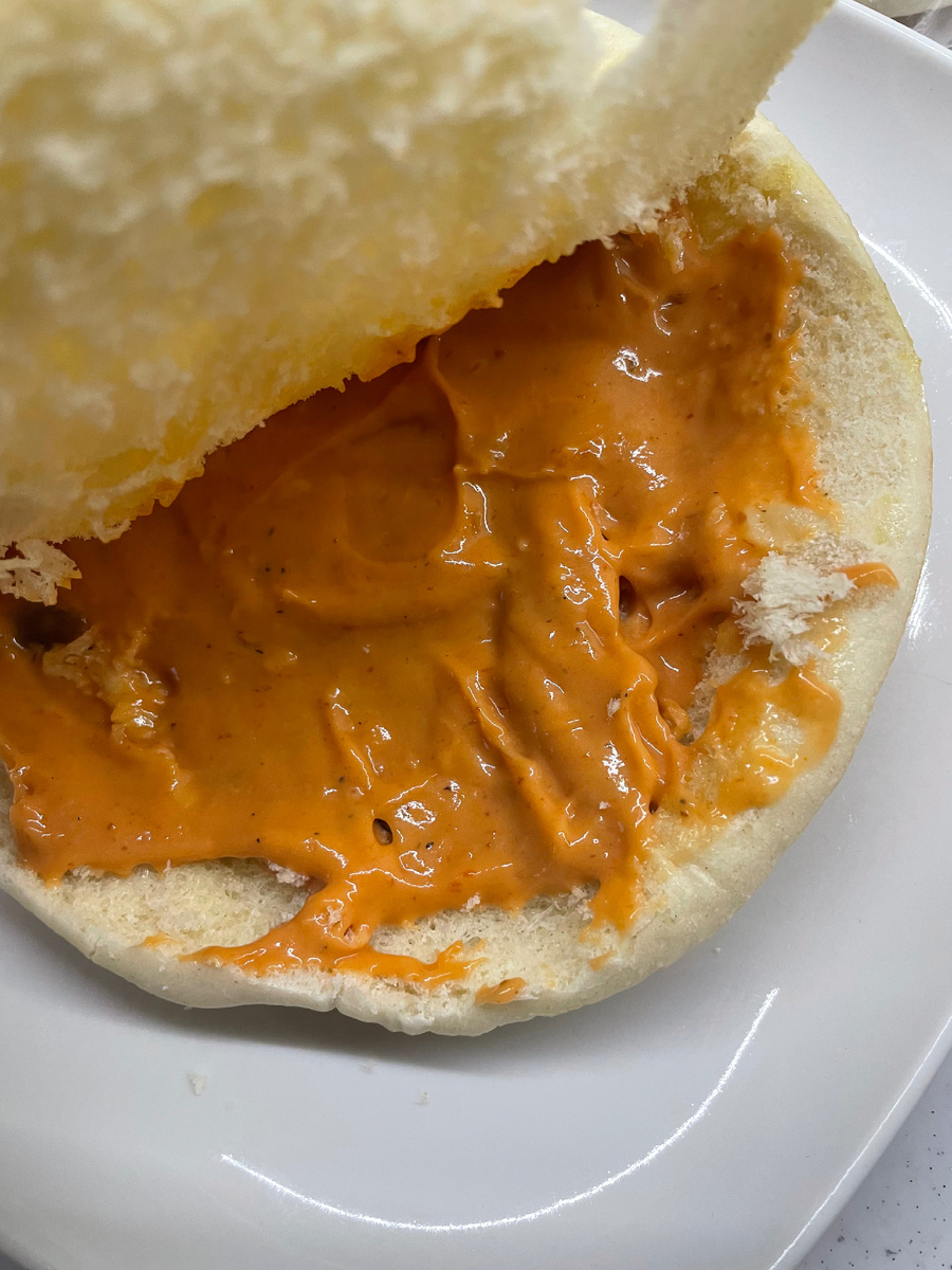Питу намазала внутри розовым соусом (майонез +кетчуп), добавила молотого кумина для вкуса, соли и перца.