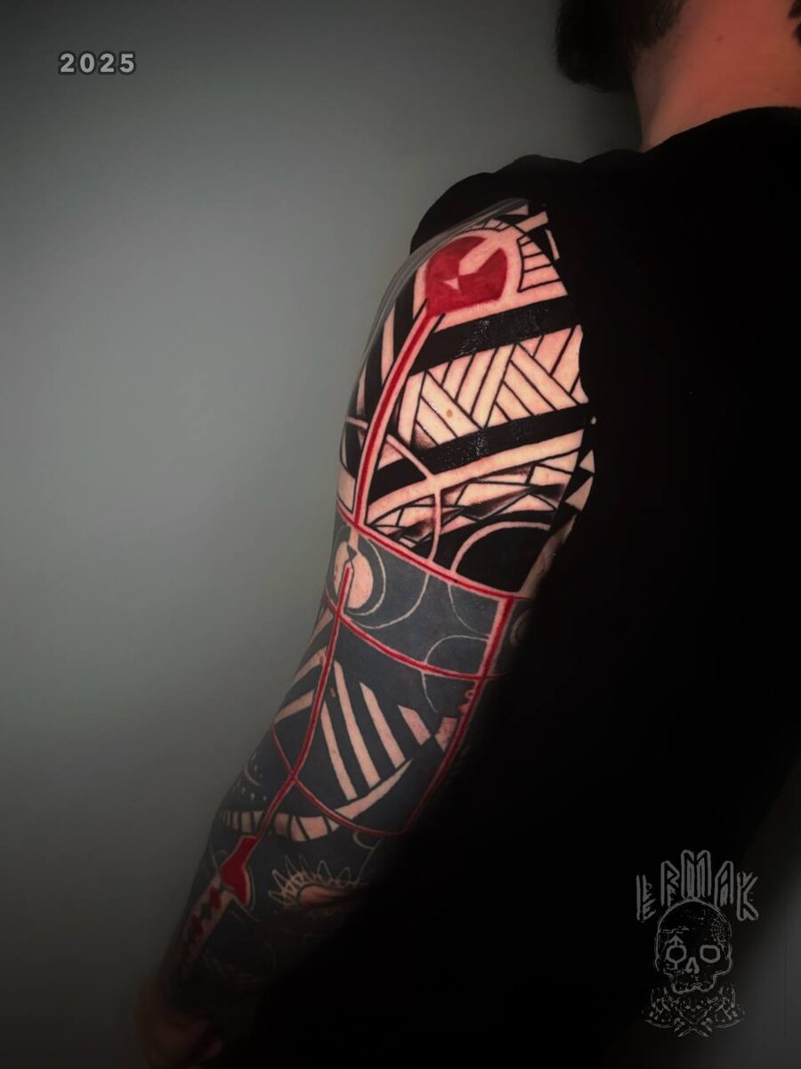 Завершили мы эксперимент с доделыванием рукава с добавлением красных элементов. Начало смотрите ЗДЕСЬ #тату #татуировка #геометния #перекрытиетатуировки #сделатьтату #татуздесь #татунебольно