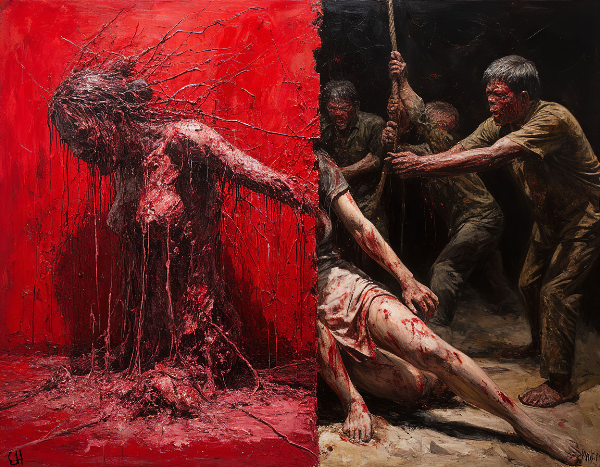 Мировая история, штука разная- войны, конфликты, бытовые проблемы. Но, хочется сказать - будьте терпимей, господа мужчины. Чтоб то, что происходит на картине стало несбыточным и кошмарным сном.