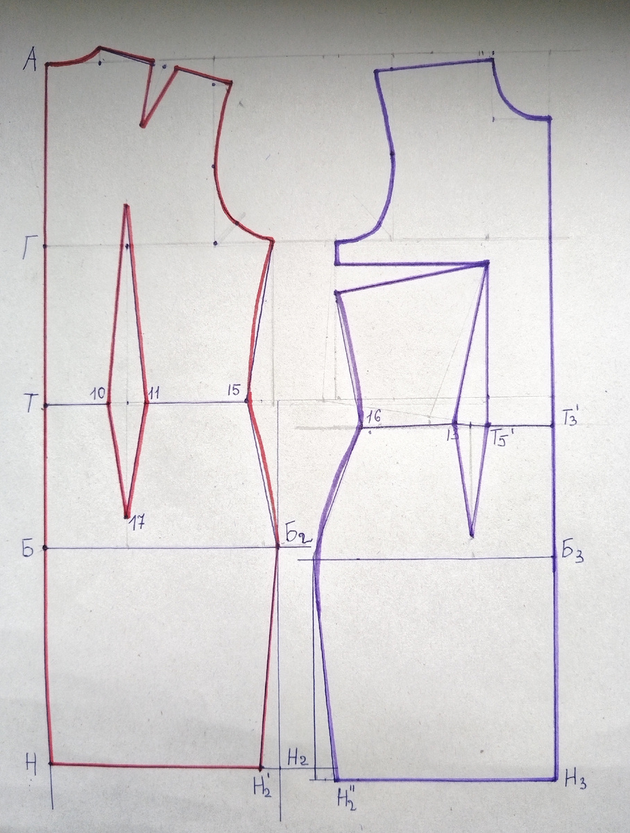 Построение основы чертежа ниже талии. Построение основы можно найти здесь Продолжаем среднюю линию спинки вниз и на ней откладываем ТБ= (Дтс÷2)-2, получаем точку Б ТН= длина от талии до желаемого уровня длины изделия, получаем точку Н. Из точек Б и Н вправо провести прямые перпендикулярные линии. ББ2= (Сб+Пб):2 Отложить от точки Б вправо и получим точку Б2. 3. Ширина по линии низа: НН2=ББ2 -для прямых изделий НН2=ББ2+ по модели - для расширенных изделий НН2=ББ2- по модели- для зауженных изделий Продолжить среднюю линию талевой вытачки вниз не доходя до линии бедер 4-6 см и соединить точки 10 и 11 на талии с концом вытачки. На полочке делаем все тоже самое, но прежде нужно произвести моделирование лифа. Уменьшаем раствор талевой вытачки, за счет переноса ее части в нагрудную вытачку. Для этого нужно перенести чертеж переда на кальку или плотную пленку. Далее определим раствор талевой вытачки по формуле: (Сб+Пб)-(Ст+ПТ) Мы получим разницу между талией и бедрами. Теперь от полученн