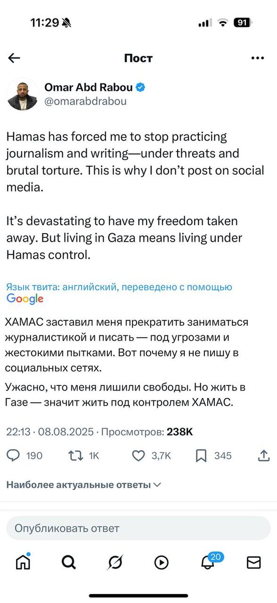 Журналист из Газы утверждает, что ХАМАС убьет его если он будет писать правду: «ХАМАС заставил меня прекратить работать журналистом и писать — под угрозами и жестокими пытками. Именно поэтому я не публикую ничего в соцсетях. Тяжело осознавать, что у меня отняли свободу. Но жизнь в Газе — это жизнь под контролем ХАМАС.»