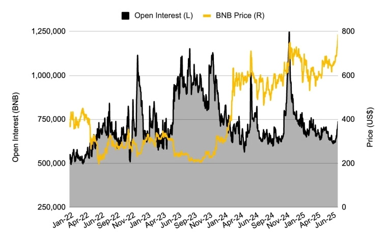 Перед тем как вы погрузитесь в изучение статьи, обратите внимание на тот факт что всё упомянутое в ней не является финансовой рекомендацией для принятие более взвешенного решения просьба провести свое собственное исследование. ________________________________________________________________________ В то время как SOL и ETH привлекали все внимание, BNB незаметно обогнал их обоих в годовом исчислении (на момент 3 августа) После падения в апреле это единственная крупная криптовалюта, помимо BTC, которая вернула себе исторический максимум, что свидетельствует о сильном фундаментальном импульсе. OI альткоинов превысил 100 млрд долларов, но BNB остался на низком уровне (около 600 млн долларов) — значительно ниже прошлых пиков. Вывод? АTH BNB не был обусловлен кредитным плечом — он был вызван спотовым спросом, что сделало его более устойчивым по сравнению с аналогами. Ценность BNB заключается как в централизованной, так и в on-chain утилити. • Со стороны CEX: держатели получают скидки на торг