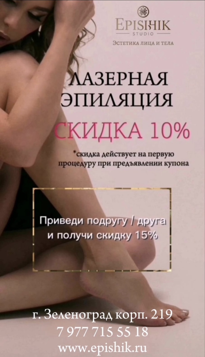🌟 ЛАЗЕРНАЯ ЭПИЛЯЦИЯ 🌟 Сделайте свою кожу идеальной! ✨ Гладкость надолго ✨ Studio EPISHIK приглашает Вас насладиться преимуществами современной лазерной эпиляции: ⭐ Быстро и безболезненно избавьтесь от нежелательных волос навсегда! ⭐ Опытный мастер обеспечат Вам индивидуальный подход и профессиональный уход. ⭐ Безопасность и стерильность гарантируют защиту Вашего здоровья. Хотите забыть о бритье и раздражении раз и навсегда? Тогда приходите в Studio EPISHIK! Адрес: Москва,Зеленоград корп. 219 Телефон: +7 (977)715 55 18 Запишитесь прямо сейчас и получите скидку 15% на первую процедуру