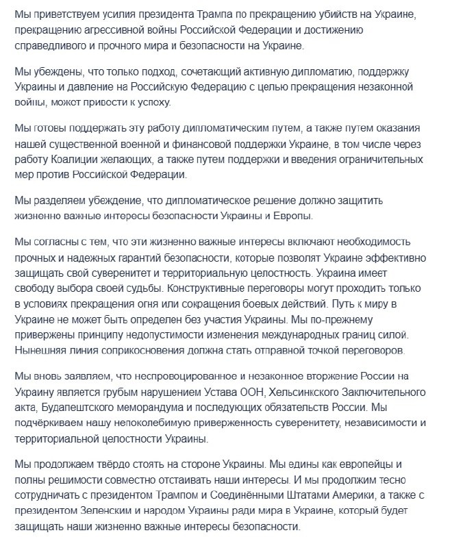 Главы Франции, Италии, Германии, Польши, Великобритании, Финляндии и Еврокомиссии создали совместную декларацию Они выступили против передачи России части территорий Украины ради прекращения огня. Еще они потребовали, чтобы Украина участвовала в переговорах. «Путь к миру на Украине не может быть определен без участия Украины. Мы остаемся привержены принципу, что международные границы не должны изменяться силой. Текущая линия соприкосновения должна стать отправной точкой для переговоров». Крысы суетятся. 👍 БайБайден. Подписаться