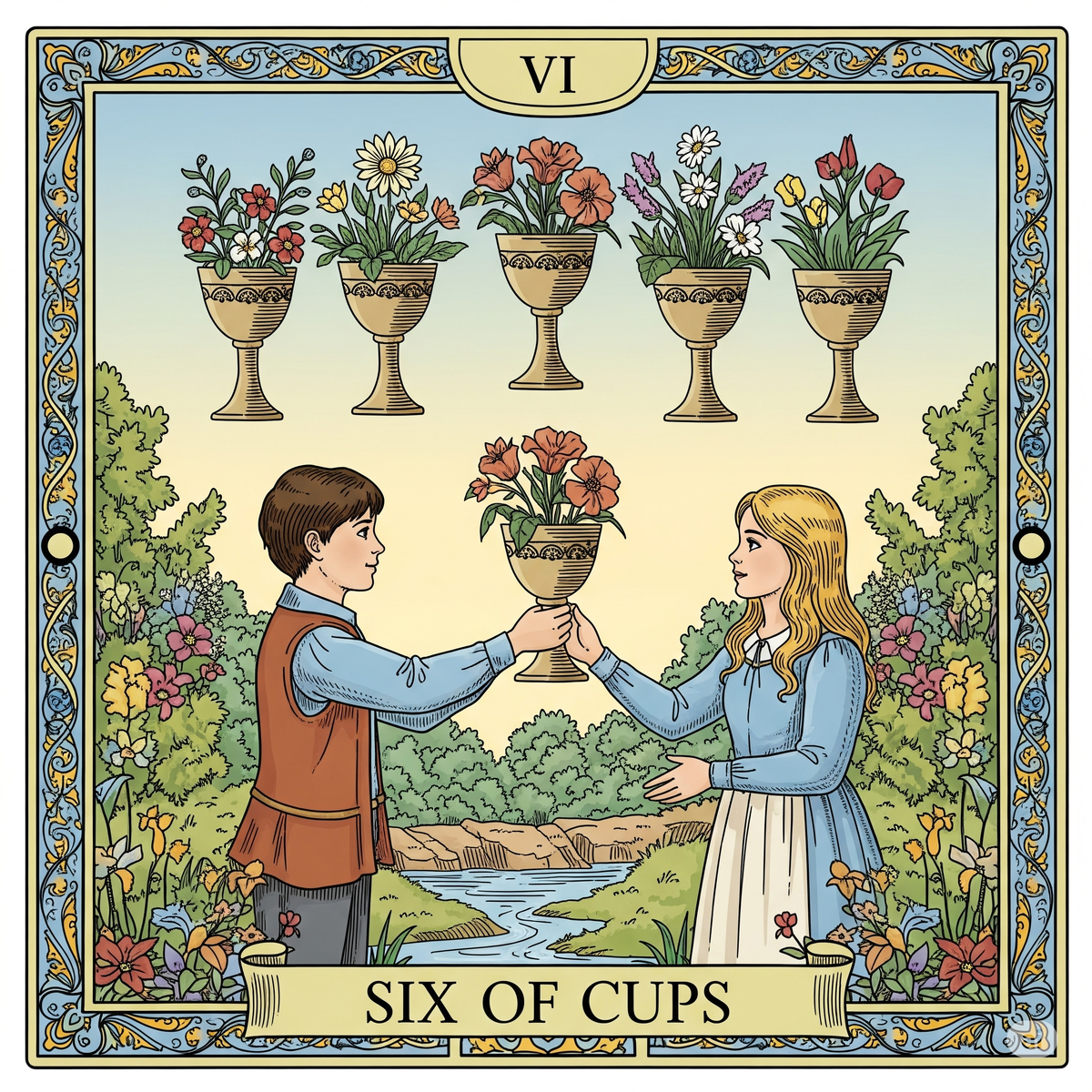 Шестерка Кубков - символ воспоминаний, детской чистоты и светлых эмоций, связанных с прошлым. В раскладах на отношения эта карта часто отражает влияние былых событий или людей, которые оставили глубокий след в сердце. Ее энергия мягкая, теплая, проникнутая ностальгией и искренностью. В прямом положении Шестерка Кубков указывает на отношения, в которых присутствует атмосфера заботы, доверия и нежности. Это могут быть связи, в которых партнеры чувствуют себя «как дома», словно возвращаясь в безопасное и знакомое пространство. Карта также может говорить о воссоединении с человеком из прошлого — бывшим партнером, школьной любовью или старым другом, с которым возникнет романтическая связь. В долгосрочных отношениях Шестерка кубков символизирует совместные воспоминания, радость от простых моментов, внимание к традициям пары. Иногда она указывает на то, что чувства основаны на глубокой привязанности, сформированной еще в начале знакомства. Жизненные ситуации: В перевернутом виде Шестерка Куб