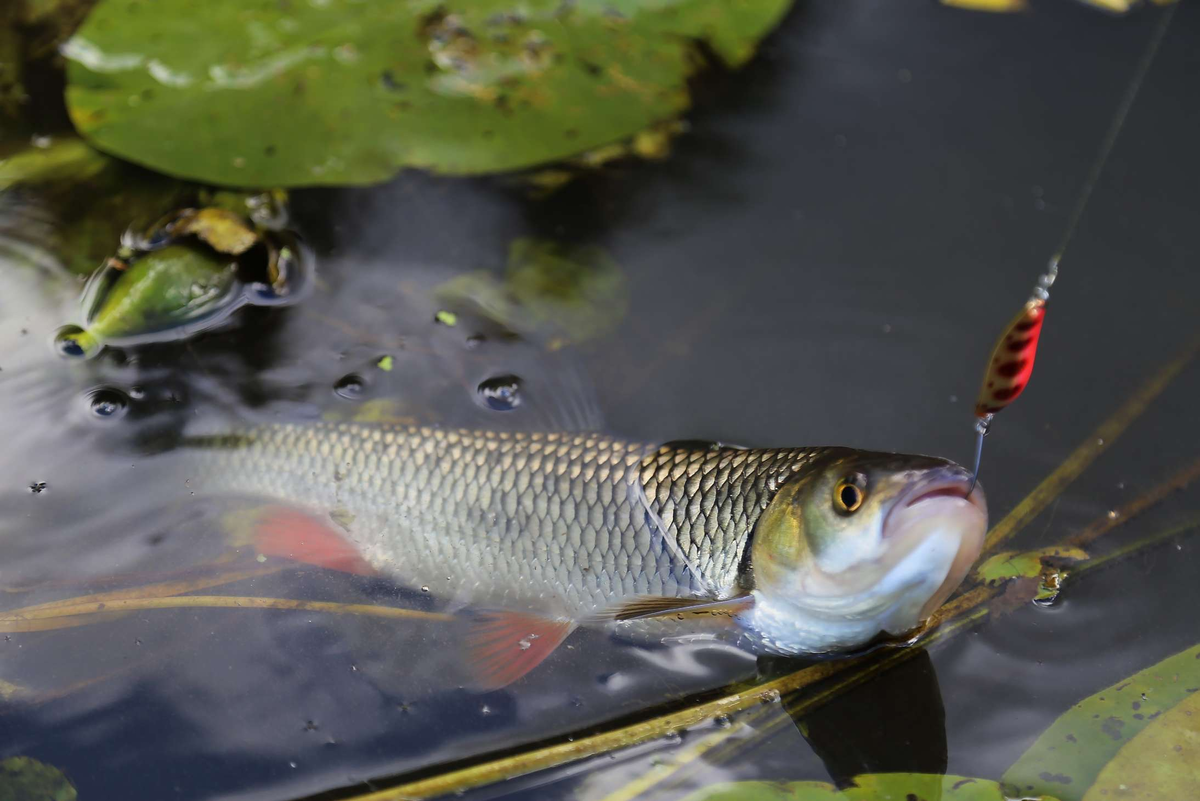 Голавль — рыба с характером. Он не гоняется за каждой блестящей штуковиной в воде, но если что-то зацепит его внимание, атака будет молниеносной. Он силён, осторожен и любит держаться в местах, где течение приносит ему еду, а укрытия дают чувство безопасности. Для начинающего спиннингиста поймать голавля — это как выиграть первый серьёзный матч: чувство гордости гарантировано. С берега голавля проще всего ловить в тёплый сезон — с конца весны до ранней осени. Ищите его на перекатах, у кромки быстрого течения, возле нависающих кустов, коряг или подмытых берегов. Летом он часто кормится прямо под поверхностью, охотясь за упавшими насекомыми. Осенью же уходит чуть глубже, но остаётся вблизи течения. Если река небольшая — облавливайте участки ниже мели, где вода ускоряется, а затем уходит в ямку. Река всегда подсказывает, где живёт голавль. Присмотритесь: всплески на поверхности, круги от выходов рыбы, колышущиеся ветви над водой, с которых падают жуки. Станьте немного выше по течению от п