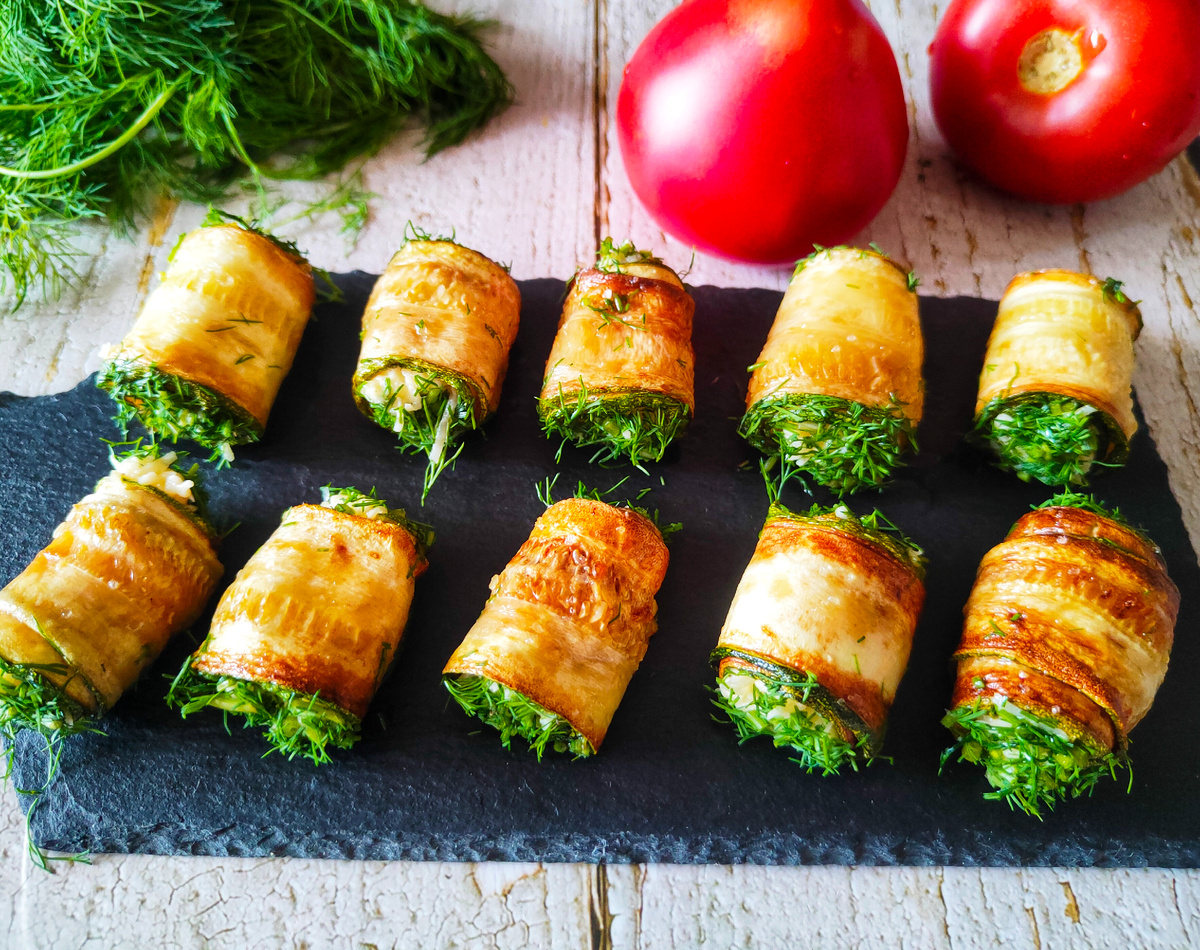 При всей простоте приготовления, такие рулетики не будут лишними даже на праздничном столе: - маленькие цукини 2 шт. - сыр полутвёрдый 60-80 г - майонез примерно 2 ст.ложки - чеснок 1-2 зубчика - укроп несколько веточек - соль - масло для жарки Цукини моем, отрезаем концы и нарезаем вдоль на тонкие ломтики, не толще 3 мм. Боковые части не используются, их можно добавить в другое овощное блюдо (например, рататуй): Разогреваем сковороду с маслом и обжариваем ломтики до золотистого цвета с обеих сторон, на огне чуть ниже максимального. Снимаем на бумажное полотенце: Для начинки смешиваем тёртый на мелкой тёрке сыр с чесноком и майонезом: Я использовала один зубчик чеснока и две ст.ложки майонеза. Начинка не должна быть сухой или жидкой. В идеале - пастообразная, как на фото: Укроп (только листочки без стеблей) нарезаем очень мелко: На остывший ломтик цукини кладём примерно 1 ч.ложку начинки и сворачиваем рулетик: Обмакиваем концы рулетиков в резаный укроп и слегка посыпаем их све