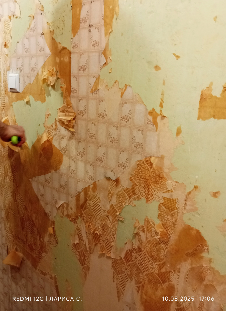 Я пшикаю горячую воду на стены, муж обдирает, я тоже немного помогаю шпателем.