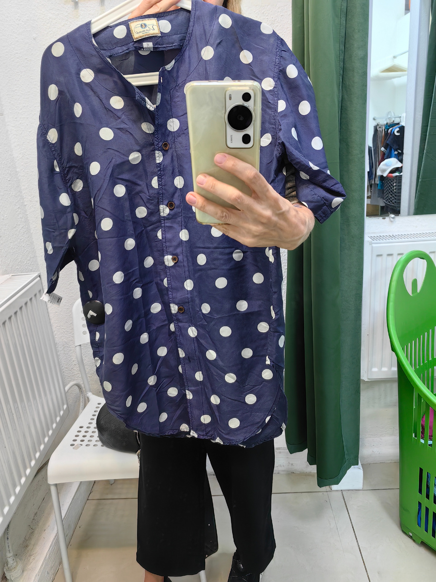 Начну с вот такой винтажной шелковой блузы в крупный горох. Я очень люблю такие вещи - винтажный шелк какой-то другой по качеству, это чувствуется на ощупь.