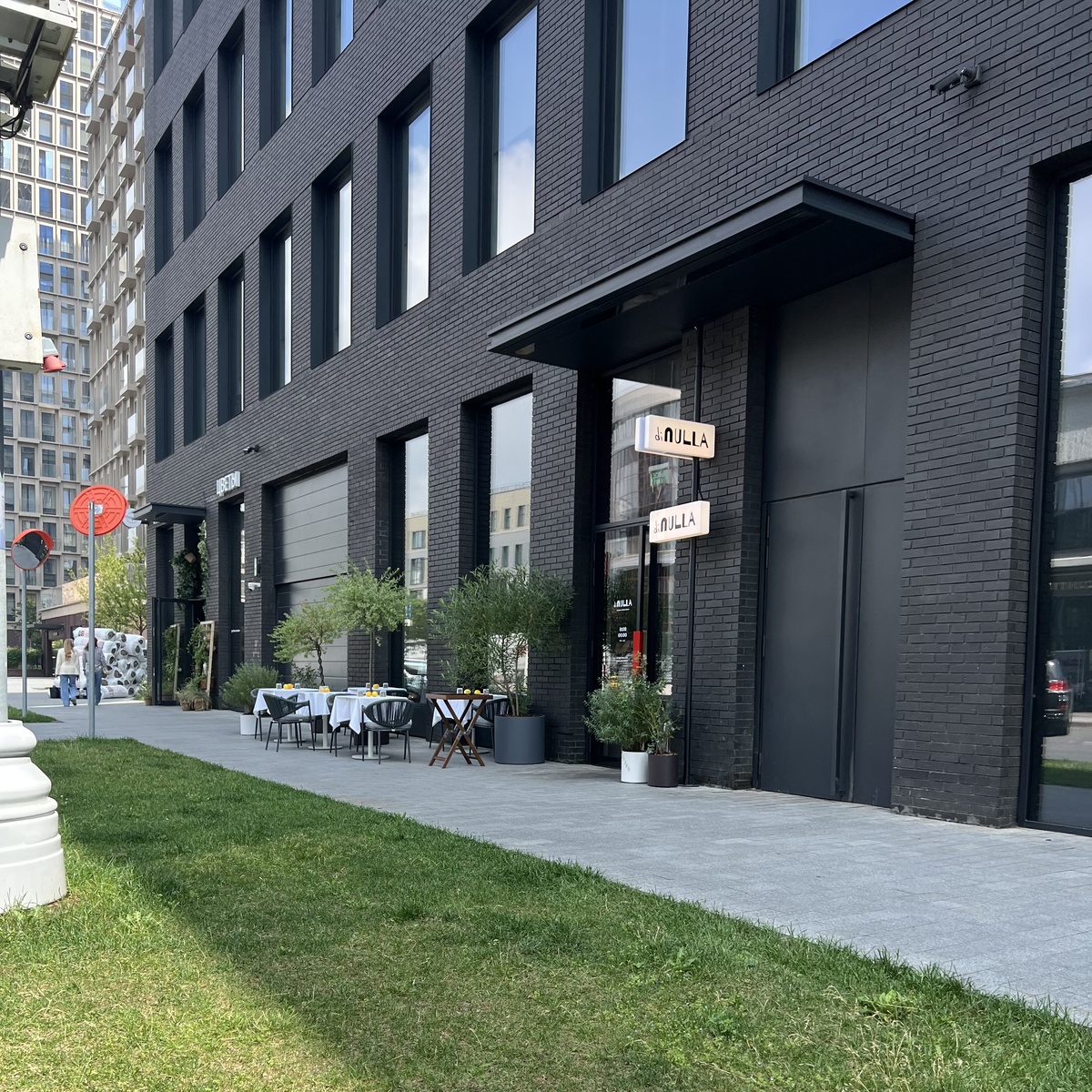 Di Nulla – новый семейный итальянский проект от «Тани и Кати», как сами владелицы определили себя, без фамилий и отчеств, видимо, пытаясь копировать итальянские истории в самой Италии и по всему миру: траттория от Луиджи, или кафе Джузеппе, или кафетерий Микеле. Задумка веселая, но пусть; на самом деле Таня – это Татьяна Красноперова, а Катя – Екатерина Солодянкина. Открылся дамский ресторан на 2-й Звенигородской улице в дорогом модном ЖК Lucky. Название у заведения простое – «не за что» или «не стоит» как ответ на «спасибо». Вход прямо с улицы. Белая вывеска и несколько столов с лимонами у проезжей части. Фасад, естественно, современный, как и весь дорогой «муравейник» богатого жилья. Черная имитация кирпича. С одной стороны заезд в паркинг, с другой подъезд, между ними там три вытянутых окна и дверь, за ней стеклянный «предбанник».