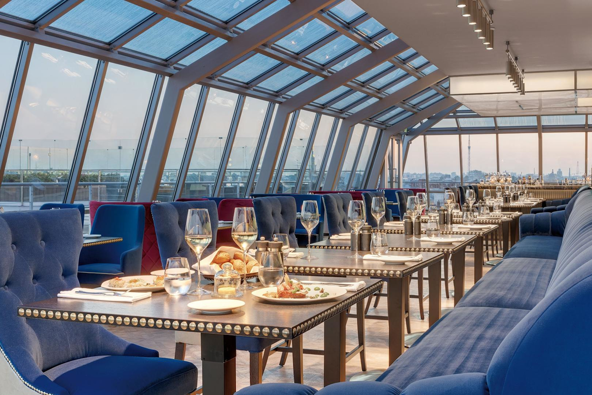 Panoramic interior view of Bellevue restaurant at Moika 22 with elegant decor and city skyline visible through expansive windows restorating