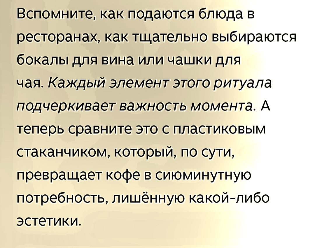 Вот в таких случаях, каюсь, очень тянет посоветовать спыкеру сделать лицо попроще, хотя вообще-то это и близко не моя риторика((( Потому что да, чьёрт побьери, иногда банан — это просто банан, а кофе — это просто кофе. Да, именно сиюминутная потребность/желание. Потребность согреться в промозглый день, например. Или чуть-чуть порадовать себя по пути на работу утром. Или просто взять стаканчик, сесть на скамеечку в парке и кайфовать. Без ритуала и подчеркивания важности момента.