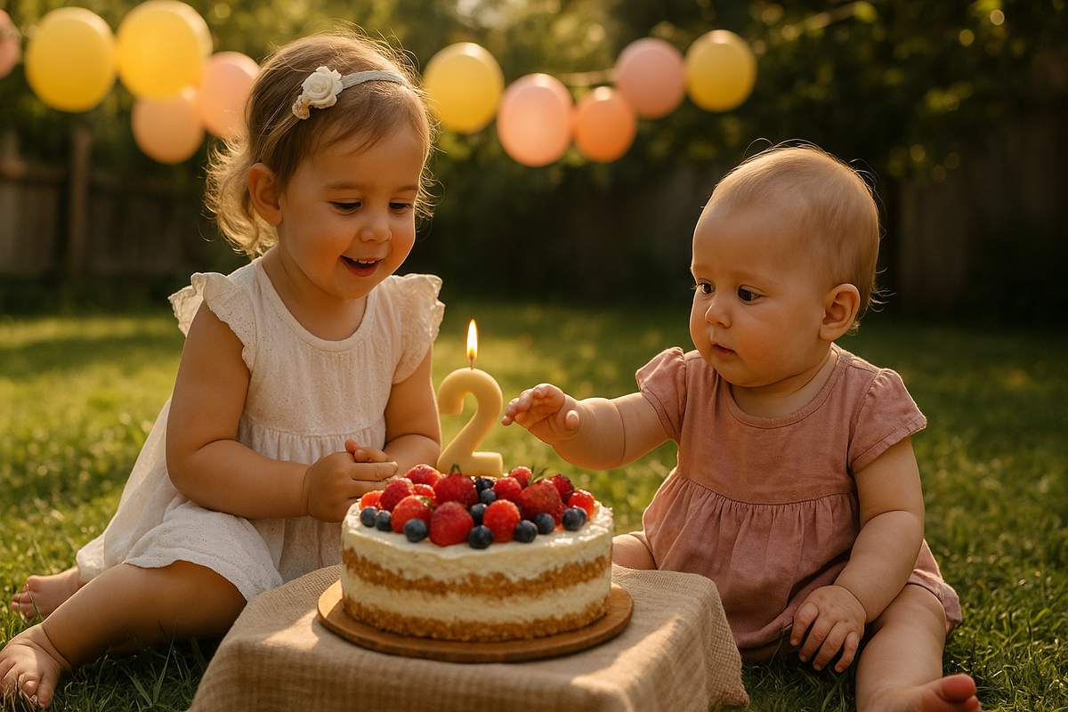 Во дворе развесили разноцветные флажки и шары. На столе — лёгкая скатерть, цветы в вазе, фруктовый торт с двумя свечами. На лавочке — коробки с бантиками, мягкие игрушки, книжки с толстыми страницами. Рядом — милая суета: бабушки угощают пирогом, дедушка снимает всё на камеру, друзья семьи улыбаются, переговариваются, делают снимки на телефоны.