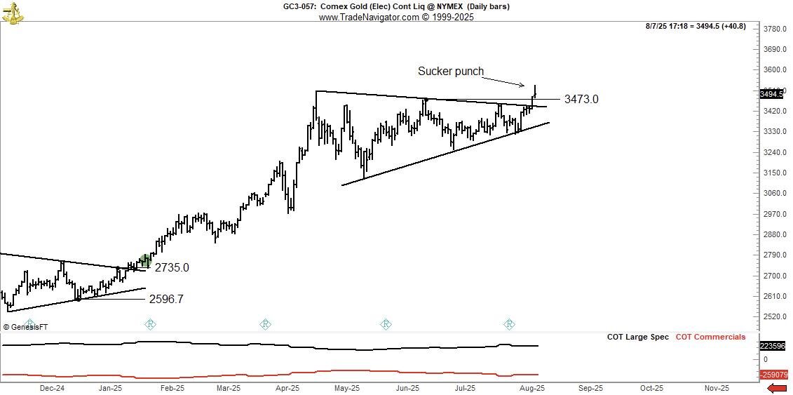 Золото готовит удар в спину рынку На графике Comex Gold мы видим классическую ловушку — так называемый sucker punch. После долгой консолидации в сужающемся треугольнике цена выстрелила вверх, пробив сопротивление на 3473$, и тут же вернулась в зону неопределённости. Для большинства участников это выглядит как подтверждённый пробой и сигнал на вход. Но в таких ситуациях часто происходит обратное: маркетмейкеры и крупные игроки используют импульс, чтобы собрать ликвидность, а затем резко развернуть цену. Почему золото растёт? Здесь сходится несколько факторов. Во-первых, ускоряется инфляционное давление — инвесторы ищут защиту капитала в реальных активах. Во-вторых, политическая напряжённость и торговые конфликты (в том числе недавние тарифы США против Швейцарии) создают угрозу поставкам и стимулируют скупку золота на споте. В-третьих, растёт интерес центробанков: они наращивают золотые резервы как альтернативу доллару. Как это связано с биткойном? Оба актива воспринимаются как «а