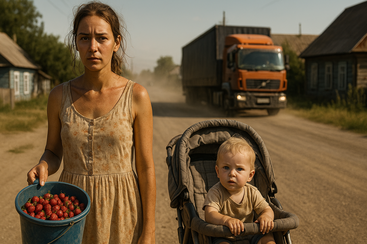 В тот июльский день я, как обычно, стояла у дороги с ведром земляники. Артёмка сидел рядом в старенькой коляске. Жара стояла невыносимая, от проезжающих фур поднималась пыль, но выбора не было — нужно было что-то продать, чтобы купить хлеба.