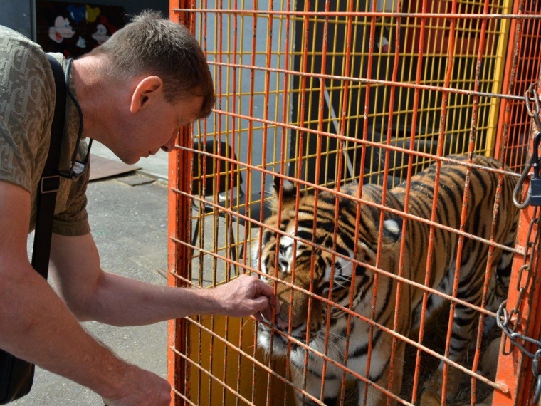 Повелитель тигров и львиц работает в клетке, опираясь на тросточку. Виталий Смолянец — единственный в мире дрессировщик на протезах. Однако это не мешает ему укрощать хищников и показывать уникальные номера. Дикие животные рядом с ним превращаются в послушных котят. По команде они занимают места на тумбах, катаются по манежу, играют в чехарду, перескакивая друг через друга, ходят на задних лапках, прыгают через горящее кольцо и даже аккуратно берут мясо изо рта дрессировщика. На одну из репетиций попал корреспондент ИА «ОМСКРЕГИОН».