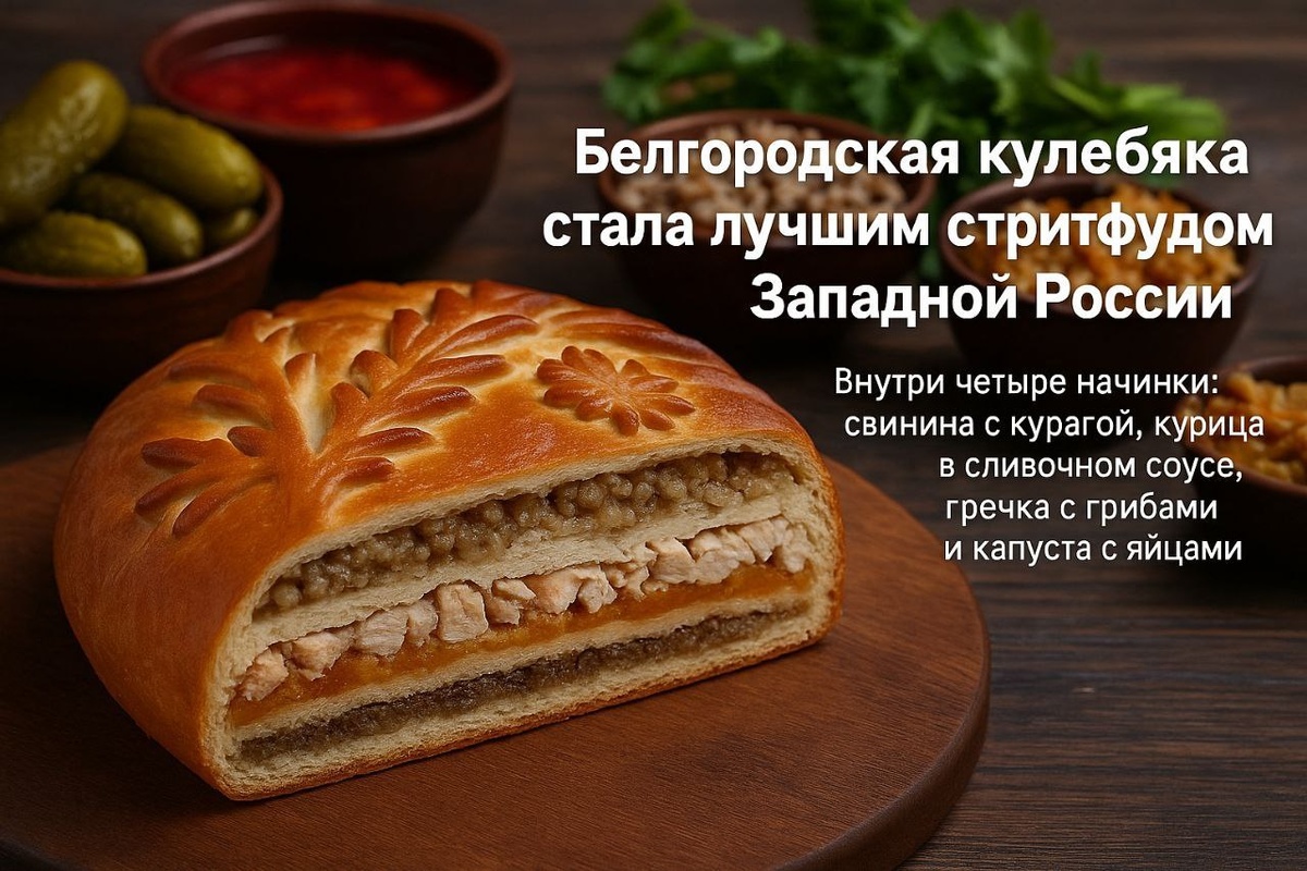 На фестивале уличной еды Russian Street Food Awards: Запад 2025 белгородская кулебяка заняла первое место. Пирог с четырьмя начинками — свининой с курагой, курицей в сливочном соусе, гречкой с грибами и капустой с яйцом — признали лучшим стритфудом Западной России.