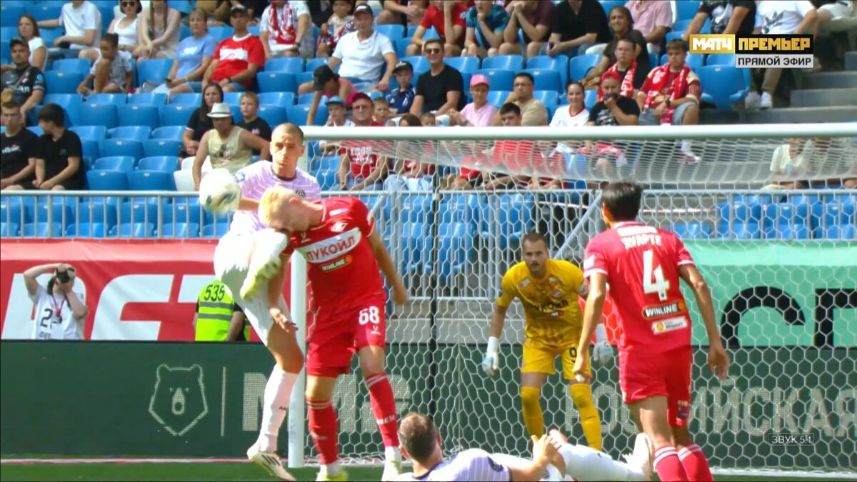 В центральном матче третьего тура спорный эпизод произошел уже на первой минуте. Его я проглядел по причине того, что в трансляции крупным планом потенциальное нарушение не показали, а на стадионе его никто не видел, поэтому даже апелляций к арбитру не было. К счастью, один читатель предоставил пост из телеграм-канала «Але, рэф», где крупный план нашелся, а речь идет об игре Дивеева рукой в собственной штрафной площади.