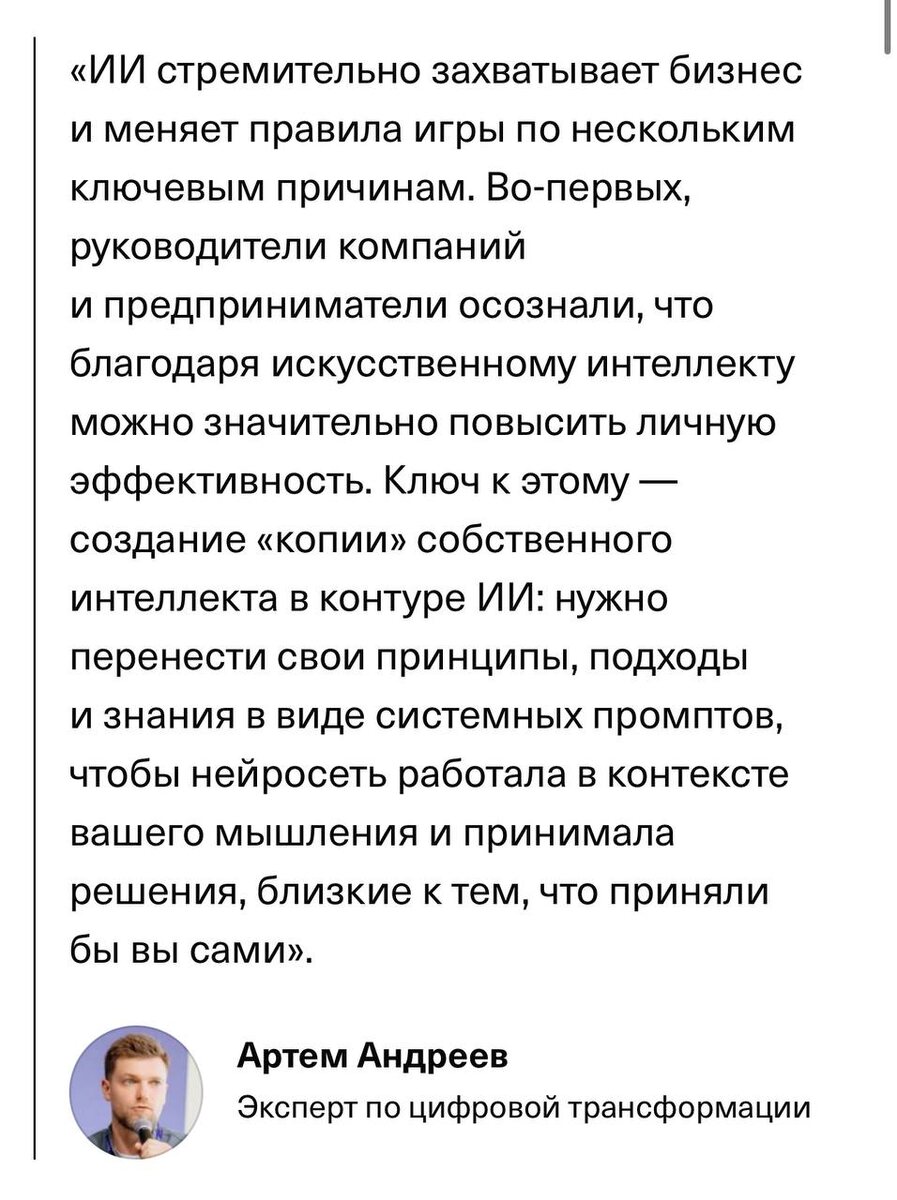 Поделился видением вектора развития ИИ для бизнеса в ближайшие годы. Краткие нейротезисы статьи: Инструменты для развития бизнеса на ближайшие 5 лет Искусственный интеллект как драйвер роста • ИИ стал реальностью настоящего и приоритетом в бизнес-стратегии. • В России уровень применения ИИ достигнет 50% в 2024 году. • К 2025 году эффект от внедрения ИИ в России составит 1 трлн рублей. • К 2026 году 95% взаимодействий бизнеса с клиентами будет осуществляться с помощью ИИ. Вовлеченность персонала как ключевой актив • Вовлеченность сотрудников связана с финансовыми результатами и производительностью. • Компании с высоким уровнем вовлеченности получают на 21% больше прибыли и на 17% выше производительность. • Пять шагов к повышению вовлеченности: оценка уровня, объяснение смысла, обратная связь, развитие персонала, поддержка лидеров. Адаптивность и технологическое лидерство • Гибкость, инновационность и обучение важны для адаптации к изменениям. • Успех зависит от баланса между технологи