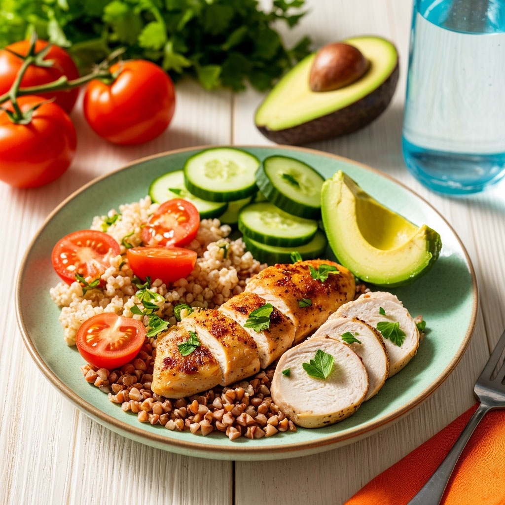 • Обед: Гречка (100 г), куриная грудка (150 г), салат с огурцом и 1 ст.л. оливкового масла (35 г белка, 50 г углеводов, 15 г жиров).