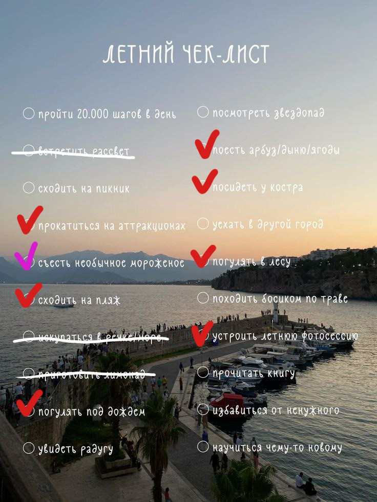 Встретить рассвет- предпочитаю ночи проводить во сне. Ни один рассвет ни стоит моего плохого самочувствия . Стара я для таких вещей ))Искупаться в реке/море- море слишком далеко. А в реках у нас в Сибири после Ильина дня не купаются (у меня так родственница заболела и умерла, слишком простыла, заслужила кости). Так что с этим опоздала.Приготовить лимонад. Просто не хочу и не понимаю, зачем мне его готовить. Не интересно.