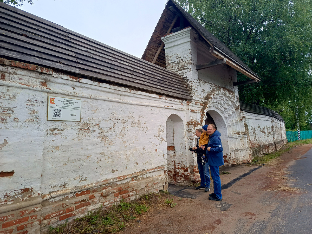 Всю ночь лил дождь. Нет, не дождь - ливень. Было ощущение, что кто-то открыл на небе кран и забыл закрыть ))) Утром было пасмурно и холодно - всего +12° ((( Когда мы собрали вещи, снова заморосил дождик и было принято решение ехать домой без осмотра города. Единственное, мы заехали по пути в Троице-Гледенский монастырь. Женщина, у которой мы снимали дом, сказала, что там очень красиво. Решили проверить ))) На самом деле от монастыря почти ничего не осталось: две стены, сторожевая башенка, большой Троицкий собор и церковь Тихвинской иконы Божией Матери с трапезной. Территория совсем маленькая. От сторожевой башни открывается красивый вид на реку Сухона и Великий Устюг. Правда опять поливал дождь и вся красота пряталась за серой дымкой. На территории монастыря стоит высокая трава и вокруг царит тишина. Выкошено только вокруг собора. Сам собор красивый - особой северной архитектуры: с высоким крыльцом и колокольней. С двух сторон в фундамент вмурованы огромные валуны. Странно, конечно