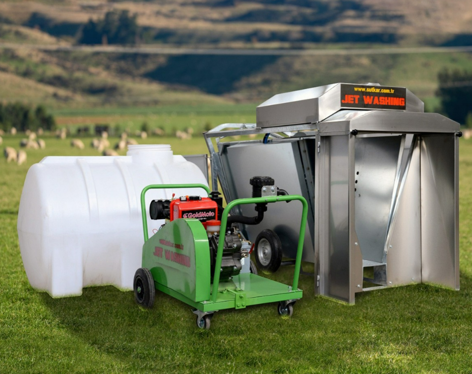 Машина для мойки мелкого рогатого скота состоит из основного корпуса, насосно-моторной группы и резервуара для воды.