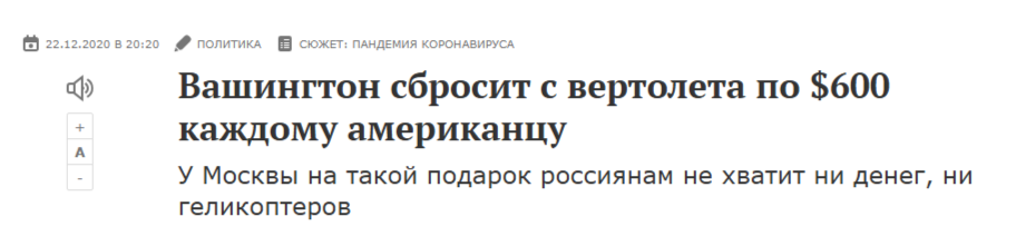 В памяти свежо, как российские СМИ неодобрительно высказывались о "печатании" денег в США во время пандемии. Называя их ничем не обеспеченной эмиссией, "вертолетными деньгами", а также обвиняя США в "экспорте инфляции" на весь мир. Тогда СМИ словами российских экспертов убеждали россиян, что вертолетные деньги - это какое-то абсолютное зло, которое не способно как-либо поддержать экономику, способно только разогнать инфляцию. Поэтому, соответственно, только вредит экономике. Более того, эти вертолетные деньги должны были даже "подорвать доллар", если верить РИА Новости. Действительно, в годы пандемии в США проводилось активное бюджетное стимулирование (простыми словами - раздача денег из бюджета) с целью поддержки экономики и граждан в трудный период. Эти деньги буквально раздавали компаниям и гражданам, чтобы они поддерживали свой бизнес или свою жизнь в периоды локдаунов. По этой причине начала очень резко расти денежная масса в обращении, а следовательно их ценность - снижаться. Эта