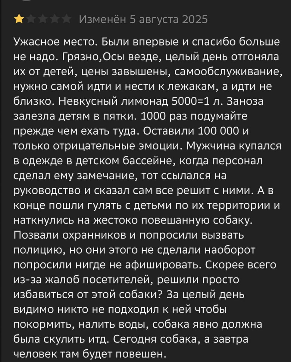 "Мы не рассчитали": базу отдыха в Алматы обвинили в смерти собаки Клиенты одной из баз отдыха в Алматы обнаружили на её территории повешенную собаку. Сотрудники признались, что животное погибло случайно. О ситуации в социальных сетях рассказали зоозащитники: "Повешенную собаку во время прогулки с детьми обнаружила одна из посетительниц базы отдыха. По словам очевидцев, животное, возможно, долго находилось без пищи и воды и могло страдать перед смертью". В свою очередь администрация развлекательного комплекса опубликовала пост, в котором объяснила, что с собакой произошёл несчастный случай. В пресс-службе Департамента полиции Алматы сообщили, что по данному факту возбуждено уголовное дело. Подробности: https://cmn.kz/my-ne-rasschitali-bazu-otdyha-v-almaty-obvinili-v-smerti-sobaki/ Фото: Instagram/kare.kz ✍️Подписывайтесь на t.me/CMN_KZ