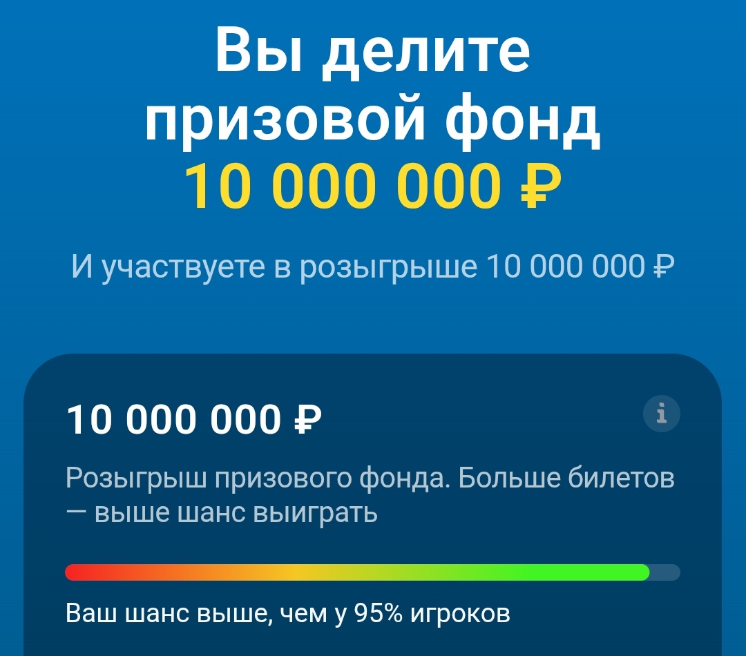 Добрый день, друзья! Я и некоторые мои подписчики активно играем в игру 5 букв в приложении от Т-банка. Недавно банк объявил о гарантированном денежном призе, который получит каждый участник набравший 50 билетов (отгадавший 50 слов). На данный момент у меня 55 билетов. Общий призовой фонд 10 миллионов рублей. Его разделят поровну между участниками. И вот сегодня стало известно, сколько же примерно мы получим. В приложении опубликовали количество участников и на данный момент их уже 314895. Делим 10 000 000 на 314895 и получаем ... 31,75₽. И разумеется с каждым днём количество участников будет только расти (данные обновляются раз в сутки) и достанется нам еще меньше 😂 Смысла дальше угадывать слова больше не вижу, так только совсем от скуки, чтобы потренировать мозг, но каждый день заходить уже нет интереса. Будем надеется, что выиграем другие призы, которые будут разыгрываться помимо гарантированного призового фонда😉
