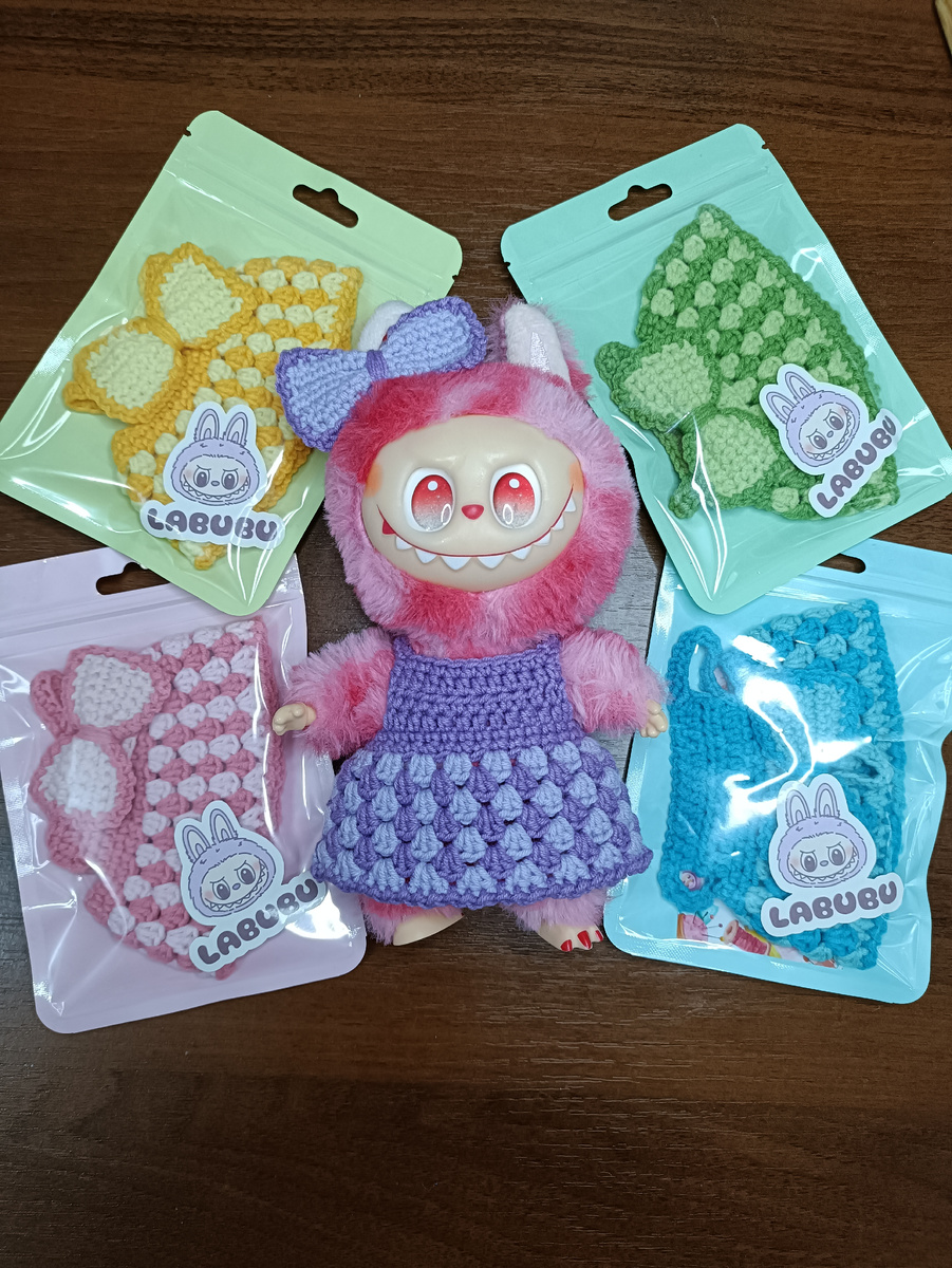 Платье 35 петель в кольцо 1-2 ряд: 35 столбиков без накида 3 ряд: 3 петли подъёма, 2 полу столбика с на километров в 1 петлю, (пропустить столбик, 3 полу столбика в 1 петлю) повторить до конца ряда. 4 ряд: 3 петли подъёма, 2 полу столбика в 1 петлю, (3 полу столбика в 1 петлю в промежутке) повторить до конца ряда. 5 - 9 ряд: как 4 ряд, чередуя цвета 8 ряд: 1 петля, 1 соединительная петля, чередуем до конца ряда Начинаем сверху вязать лямки. 1 ряд: От 11 столбика предыдущего ряда вяжем 12 полустолбиков с накидом. 2 ряд: повернуть работу, 12 полустолбиков с накидом 3 ряд: повернуть работу, 12 полустолбиков с накидом, набрать 12 петель, пропустить 8 столбиков предыдущего ряда, 7 столбиков без накида, 12 петель, присоединить к 1 столбику 3 ряда. Обвязать по кругу столбиками без накида. Бант Набрать 13 петель 1 - 7 ряд: 12 столбиков без накида Обвязать по кругу 1 воздушная петля, 1 соединительная петля Резинка Набрать 18 петель в кольцо, обвязать столбиками с накидом. Присоеден