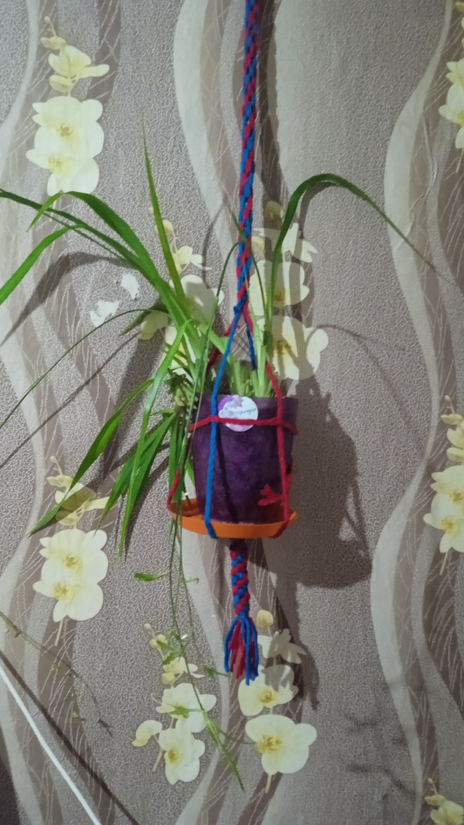 Для этого я взяла два цвета ниток. Нарезала нити по три штуки , и приступила к работе👇 Кладем крестом нити и начинаем плести,. Красную нить загибаем через синию вдоль красной, затем синюю загибаем через красную, и второй конец красной загибаем через синюю, затем берем второй конец синей и загибаем ее , протягивая внутри красной , первой нити. Как на рисунке👇 Должно получиться вот так👆. Стягиваем аккуратно все концы, и повторяем тоже самое. Так продолжаем плести нужного размера косичку. Далее как сплели нужную длину, берем и связываем простым узлом два цвета. Затем каждый цвет заплетаем обычной косичкой, по отдельности, должно получиться 4 косички. Косички вяжем по высоте цветочного горшка. У меня вот такой горшочек. Как провязали все четыре косички до нужной длины, нужно завязать на один узел все косички. И разделить нити так как начинали плести в самом начале, и продолжить плести красивую цветную косу. После того как провязали нужную длину, связываем все нити одним узлом, и делаем