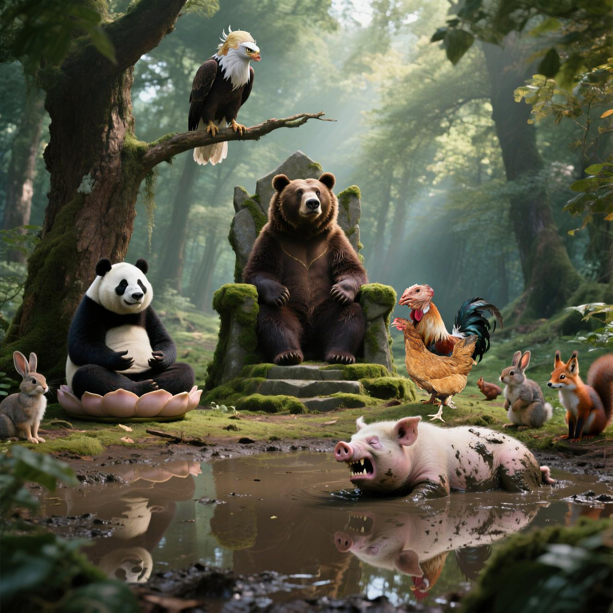 Пока Доня, размахивая крыльями, рисовал в воздухе хитроумные схемы из процентов и бонусов, а Зе тупо пытался сосчитать копытцем, на поляну вышло Само Спокойствие. Панда Си. Он невозмутимо прошествовал к своему любимому бамбуковому уголку, сел в позу лотоса (ну, почти), закрыл глаза и тихо проговорил: