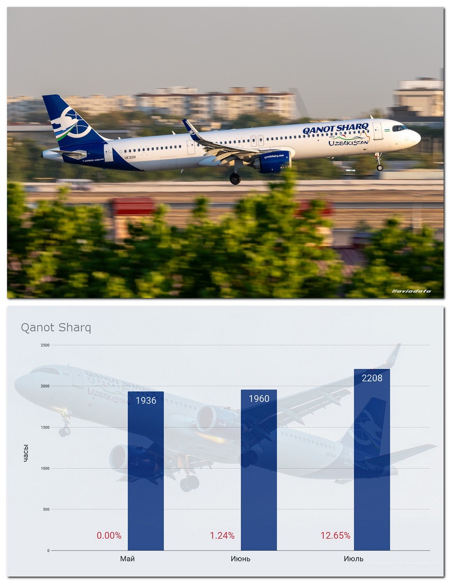 Итоги июля: Qanot Sharq В июле общий налёт превысил 2 тысячи часов, но свой рекорд в 2382 часа декабря 2024 года, авиакомпания пока не перепрыгнула. Среднесуточный налёт на одно воздушное судно увеличился ⬆️ на 9.01% и составил 11.52 часа. Суммарное количество часов налёта воздушных судов авиакомпании Qanot Sharq за июль увеличилось 🔼 на 12.65% по сравнению с июнем и составило 2208 часов. Общая динамика за последние 3 месяца представлена на графике. #статистика #qanotsharq #июль2025