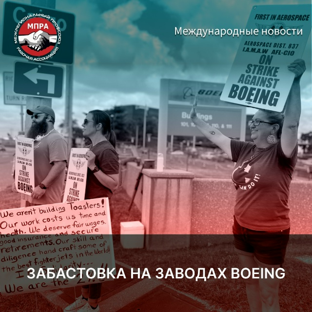 4 августа 3200 рабочих трех заводов Boeing в агломерации Сент-Луис (США) начали забастовку. Трудовой конфликт вызван разногласиями по поводу нового коллективного договора. Формально работодатель предлагает рост зарплат на 40% в течение четырех лет. Однако профсоюз, Ассоциация машинистов и работников аэрокосмической отрасли, заявляет, что это повышение сопровождается многочисленными исключениями и условиями, из-за которых многие рабочие не увидят роста зарплат в реальности. Заводы Boeing в Сент-Луисе и городах-спутниках производят военные самолеты. В 2024 году рабочие завода Boeing в Сиэтле бастовали с 13 сентября по 4 ноября и добились повышения зарплат на 38%. Представители компании говорят, что после той забастовки, в которой участвовали более 30 тысяч человек, им уже ничего не страшно. Поддержать профсоюз зава