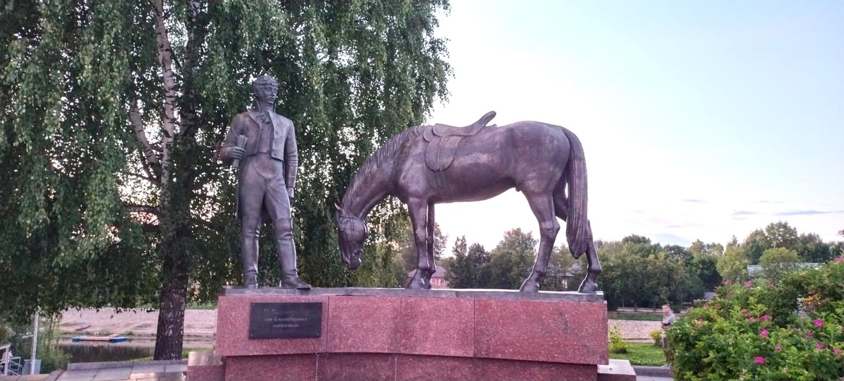 Скульптуры девушки и богини находятся чуть в стороне от поэта и коня.