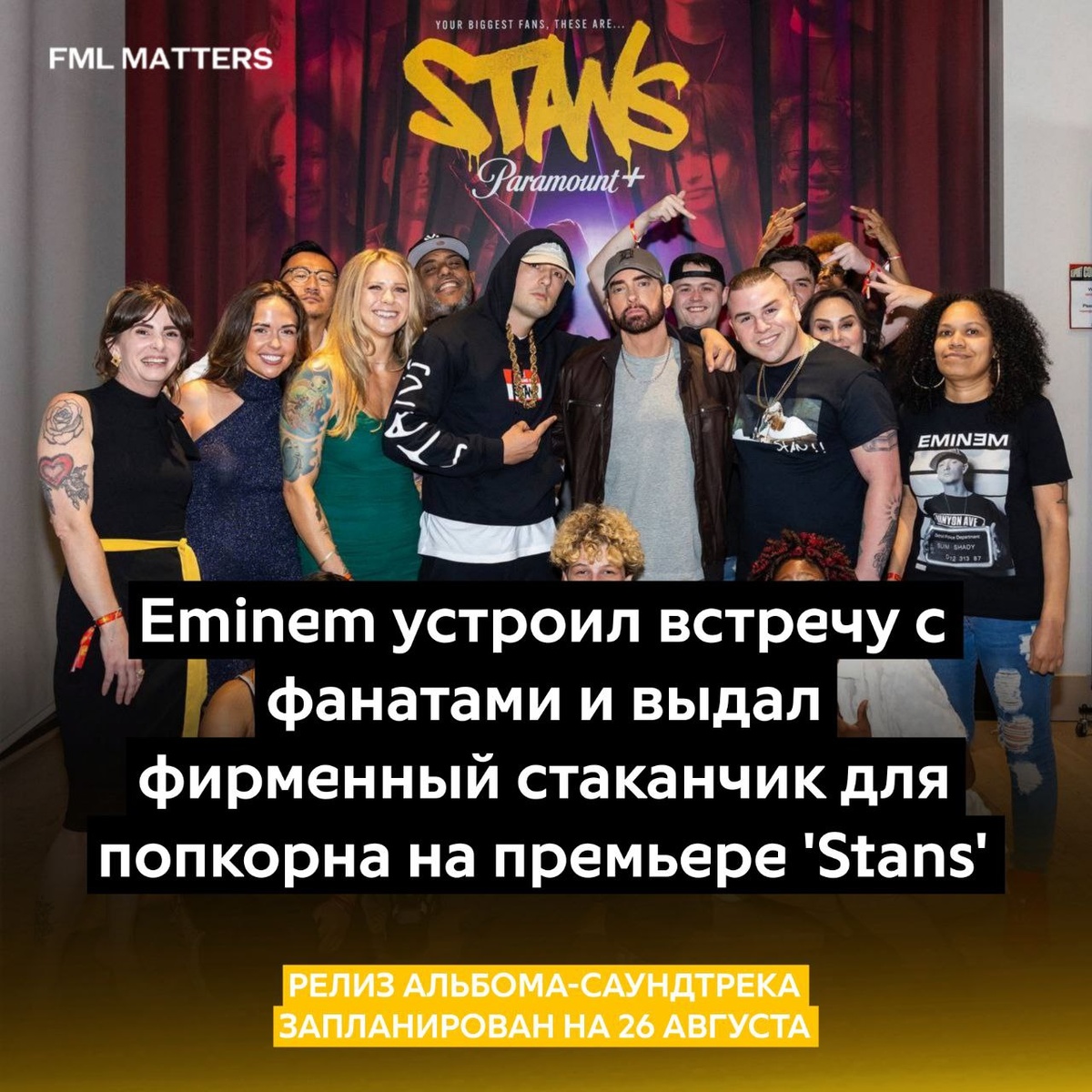 На мировой премьере фильма «Stans» рэпер сделал общее фото с фанатами, а в кинотеатрах выдавали фирменные ведёрки для попкорна похожие на упаковки рецептурных лекарств.