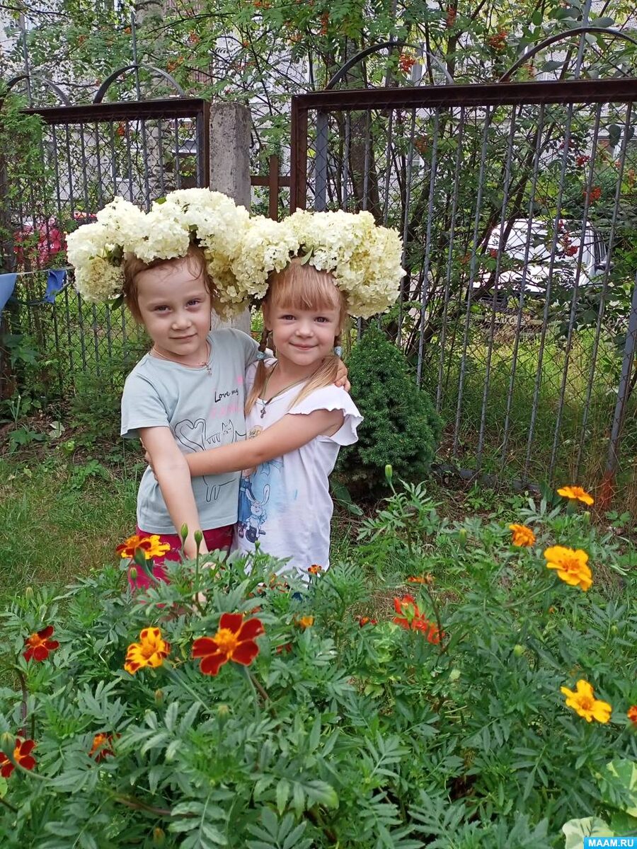 Цель: Создать радостное настроение дочке. Задачи: 1. Помочь родителям выбрать цветы и веточки для веночков. 2. Развивать умение плотно скреплять веночки и закреплять цветочки. 3. Воспитывать любовь к детям, желание смастерить веночек и нарядить любимую дочку. Материал: тонкие веточки ивы или берёзы, цветы: розы, гортензии, дельфиниум, белые и жёлтые ромашки, ножницы, джутовая верёвка. Ход работы: 1. Папа с мамой решили сделать веночек для дочки Наденьки из белых и жёлтых ромашек. Папа нарезал верёвочки длиной 10 см (10 штук) и 1 — 30 см. 2. Разложили вместе с мамой букетики белой и жёлтой ромашки в ряд. 3. На расстоянии 6–7 см папа перевязал цветы. 4. Соединил в круг, обмотал несколько раз веревкой, лишние стебли отрезал, и получился красивый веночек. Наденька довольна, а мама с папой рады. Можно смастерить веночек из цветов гортензии. За основание взяли веточки ивы. Разложили их в ряд. Скрепили джутовой верёвкой на расстоянии 7–8 см, соединили в круг диаметром 20–22 см. Постепенно при