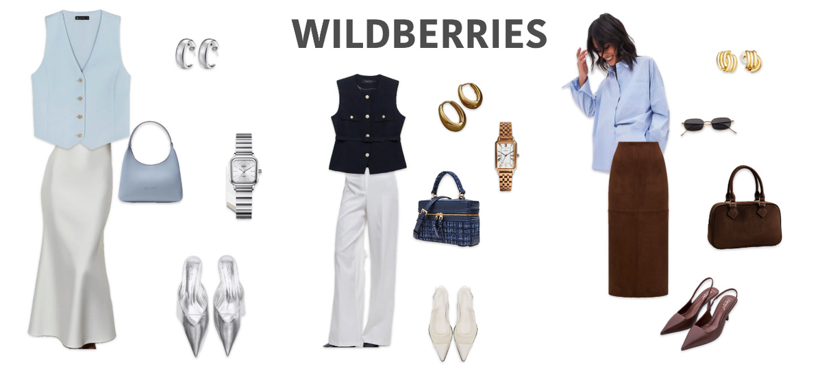 Этот образ сочетает элегантность и современную легкость. Белые брюки-палаццо создают легкую, воздушную основу, а темно-синий жилет добавляет стильной строгости и контраста. Синяя сумочка гармонично дополняет ансамбль, акцентируя внимание на цветовой гамме. Золотые часы и серьги придают образу изысканность и блеск, а туфли-слингбэки молочного цвета создают нежный и женственный завершающий штрих. Такой комплект отлично подойдет для деловой встречи или светского мероприятия, сочетая комфорт и шик.