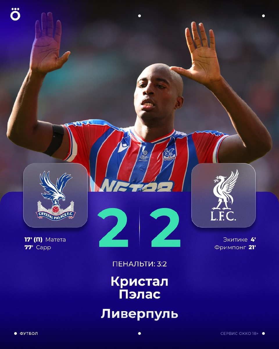 «Кристал Пэлас» выиграл Суперкубок Англии впервые в истории клуба! Исход драматичного матча решила серия пенальти 🔥 Голы новичков не помогли «Ливерпулю» 😳