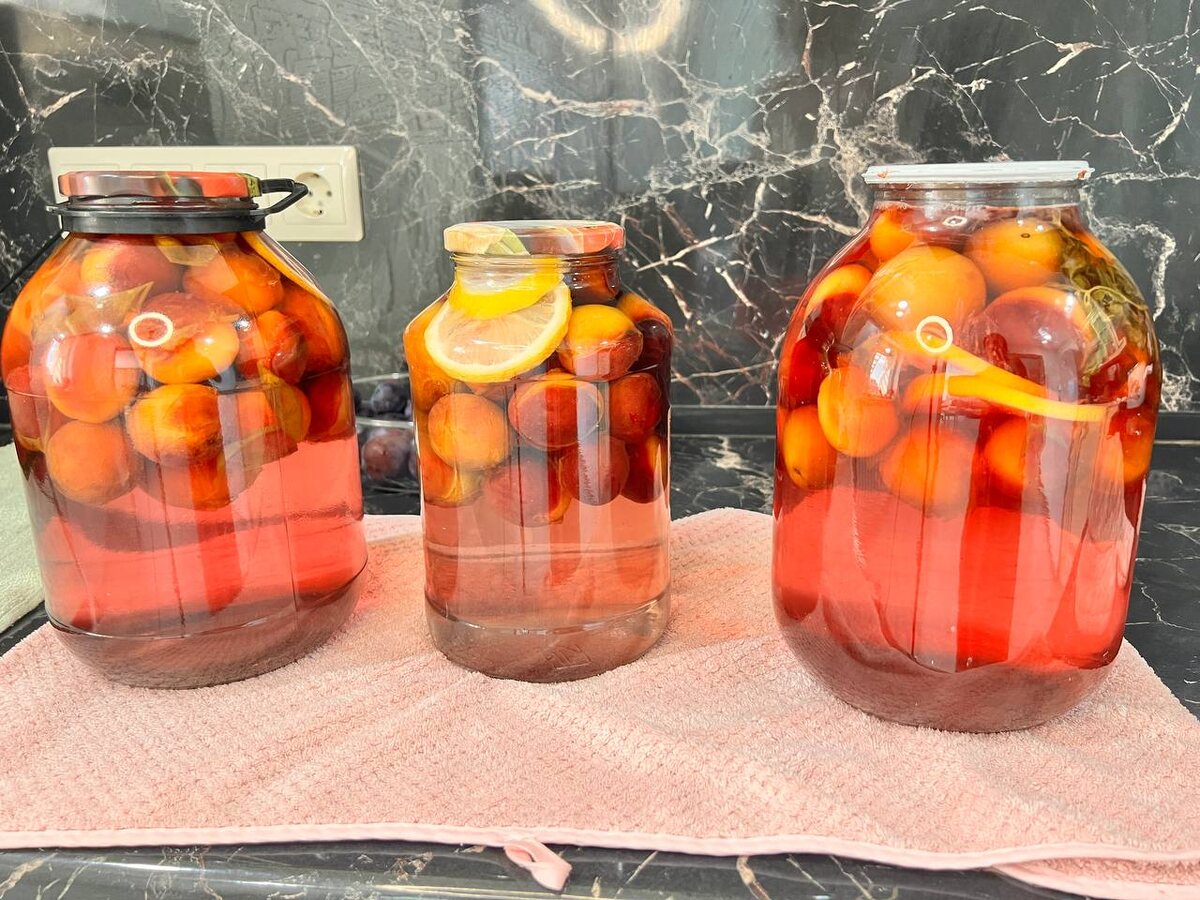 Всем привет! Приготовим очень вкусный компот из сливы, понравится всем без сомнения! Делать такой компот будем с мятой и лимоном. Нам потребуется: - сахар -слива -лимон - мята - вода. Приготовление: 1.Берем лимон и нарезаем на кружки. Так же нам потребуются стерильные банки. Их обязательно нужно простерилизовать, крышки нужно прокипятить. 2. В стерильные банки отправляем вымытые сливы, также отправляем туда лимон, примерно один-два кружка. И добавляем пару веточек мяты и воду. Кипящей водой заливаем содержимое банок. Можно заливать не до самого верху, лишь покрыть сливы. Оставляем примерно на 15 минут, затем эту воду нам нужно будет слить. Сливаем в раковину. Эта вода нам не потребуется больше. 3. Отдельно приготовим сироп. В кастрюлю наливаем воду. Расчёт такой на литр воды - 250 г сахара. 4. После того как воду из банок мы слили, заливаем всё кипящим сиропом и закатываем крышки. Наша заготовка на зиму готова. Компот получается очень вкусным и ароматным. Обязательно поп