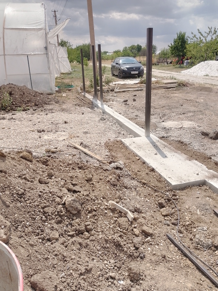 Здравствуйте! Что ж, время прошло, бетон подсох, пора снимать опалубку, что мы благополучно и сделали. что бы поверхность была ровная, с помощью алмазной чашки чуть шлифанул верхнюю и боковую поверхность, верхняя была чуть не ровная из за брусков, стягивающих опалубку, ну а боковая немного не красивая из за того, что использовали старые доски, а вот полиэтиленовую пленку использовать не стали. Ну да не страшно, что то подшлифовал, что то немного подштукатурил. Ну и приступили к монтажу перемычек. Здесь принято решение монтировать профлист, были варианты в уме и металлоштакетник, и забор жалюзи, все таки остановились на профлисте. Только монтировать будем не сплошняком, а в рамках. От столба к столбу, и с верхней и нижней перемычкой. то есть варим рамку из профильной тубы сорок на сорок, а профлист прикручивать к вваренной трубе сорок на двадцать. Много сварки, много пришлось пилить труб. На зачистку швов так вообще истратили три зачистных диски, что в принципе редкость. Все сва