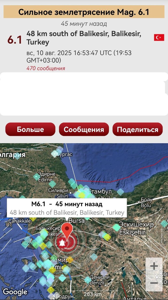В ответ на пост Облачные индикаторы от 30 июля и 31 июля уровня М5-6+ в итоге привели к сильному землетрясению в северо-западной Турции магнитудой М6.1 (фото 1). Крайний ОСТИ по зоне наблюдался 9 августа в ночь (туманный трассер на фото 2). Сегодняшнее электромагнитное предупреждение о приближении М6+ подтвердилось через несколько часов. 2 августа, после землетрясения на Азорских островах касаемо вероятности ЗМТ в Италии или западной Турции было дано отдельное предупреждение. По северо-западу Турции у меня пока всё. Незакрытые вопросы остались по Италии и по Криту-Кипру. Мои соболезнования всем пострадавшим 🙏 ======= Cloud indicators from July 30 and July 31 of the M5-6+ level eventually led to a strong earthquake in northwestern Turkey with a magnitude of M6.1 (photo 1). The last CSTI in the zone was observed on August 9 at night (foggy tracer in photo 2). Today's electromagnetic warning about the approach of the M6+ was confirmed a few hours later. On August 2, after the earthqua
