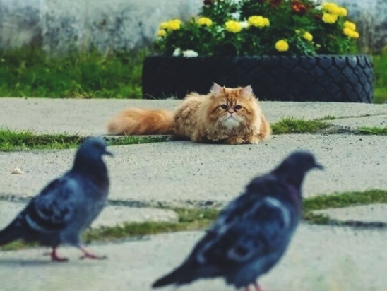 Ну и ещё ловить голубей на улицах кошкам не очень удобно. Котейкам ведь надо перед атакой хорошенько сосредоточиться, а в городских дворах и скверах слишком много шума, который отвлекает: машины, пешеходы, собаки.