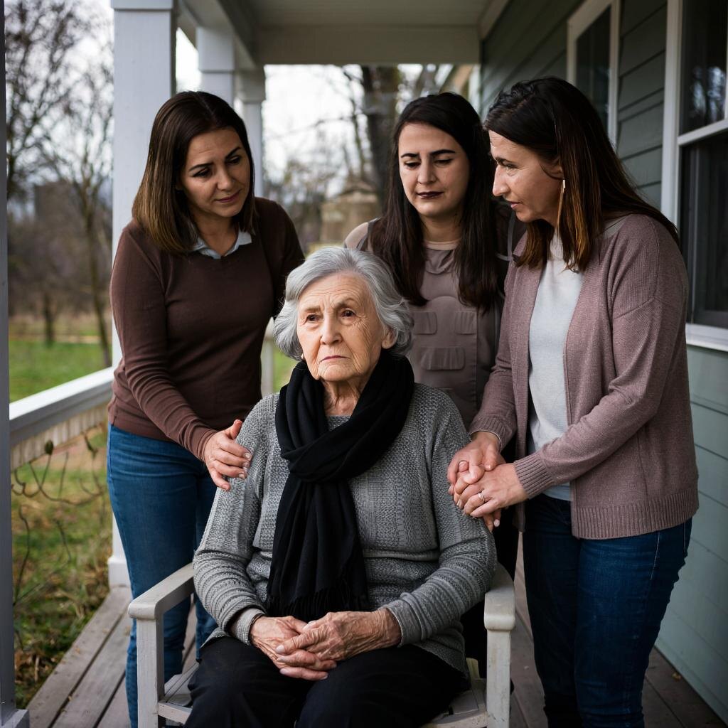 Они подошли к небольшому деревянному дому, стоящему чуть дальше остальных. Тишину нарушали лишь голоса соседей, собравшихся вокруг крыльца. Бабушка сидела на лавочке перед домом, держась за руки двух женщин. Лицо её было бледным, губы дрожали, но голос звучал спокойно и ровно.